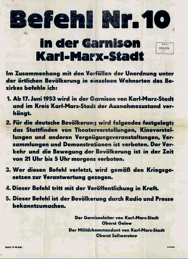 Als die DDR-Führung die Kontrolle verlor, reaktivierte Moskau seine Rechte als Besatzungsmacht. Es verhängte in 167 von 217 Landkreisen den Ausnahmezustand, verkündete das Kriegsrecht und lies Panzer rollen. Mit Unterstützung der Kasernierten Volkspolizei wurde der Volksaufstand niedergeschlagen. Es starben 50 Menschen und 15.000 Personen wurden festgenommen. Mit Hilfe Moskaus blieb Ulbricht an der Macht und letzte liberale Kräfte wurden aus Führungspositionen entfernt. Der Überwachungs- und Repressionsapparat wurde ausgebaut. Bis 1954 ergingen unter der Ägide von Justizministerin Hilde Benjamin 1.526 drakonische Urteile gegen die „Rädelsführer“, teilweise zu lebenslanger Haft.