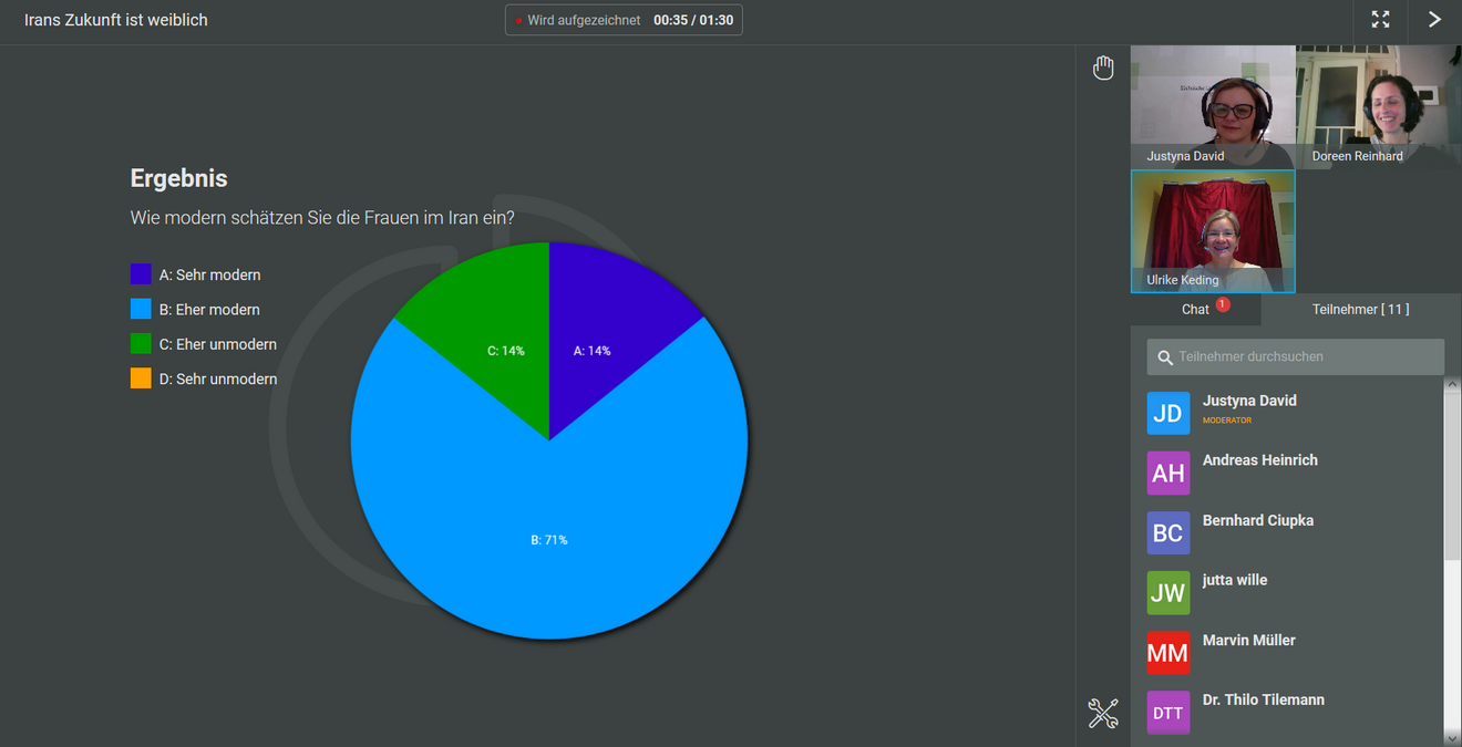 Im Rahmen der Reihe "Kontrovers vor Ort online" teilte sie ihre Erfahrungen nun mit dem Publikum und erzählte die Geschichte hinter ihrem Buch. "Für mich ist der Iran ein Mysterium, das schon immer ein hohes persönliches Interesse in mir geweckt hat", sagte Ulrike Keding ausgebildete Rundfunk- und Fernsehredakteurin des Auslandssenders Deutsche Welle, "die Idee meine Reise journalistisch zu begleiten kam mir tatsächlich erst später." Die Autorin lächelt in die Kamera, ihre Begeisterung für den Iran reißt mit. Immer wieder teilt sie persönliche Erlebnisse mit den Webtalk Teilnehmenden und nimmt sie so ein Stück mit auf ihre Reise. Drei Mal sei sie in den Iran gereist, antwortet sie auf die Nachfrage der Moderatorin Doreen Reinhard "Keiner aus meinem Freundes- und Verwandtenkreis wollte mich auf meine Reise begleiten. Das Bild der unterdrückten Frau im Kopftuch und die unsichere politische Lage bestimmen das Bild des Landes."