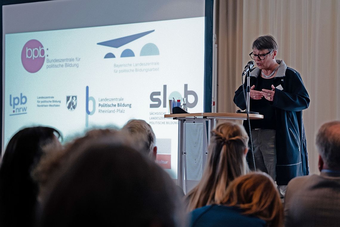 Zum Einstieg begrüßte die sächsische Staatssekretärin vom Ministerium der Justiz und für Demokratie, Europa und Gleichstellung, Gesine Märtens. Sie äußerte gleich zu Beginn ihren Respekt vor dem Vorhaben und ihre Sorge um die Demokratie: „Wir alle wissen: Es ist verdammt schwer, Menschen in der Handhabung eines System auszubilden, dass sich schnell verändert und so verletzlich und so manipulierbar - und mittlerweile auch so prekär ist“, sagte sie im Rahmen ihres Grußwortes. Und dennoch sei es wichtig, Menschen darin auszubilden. „Das Thema ist ein großes!“
