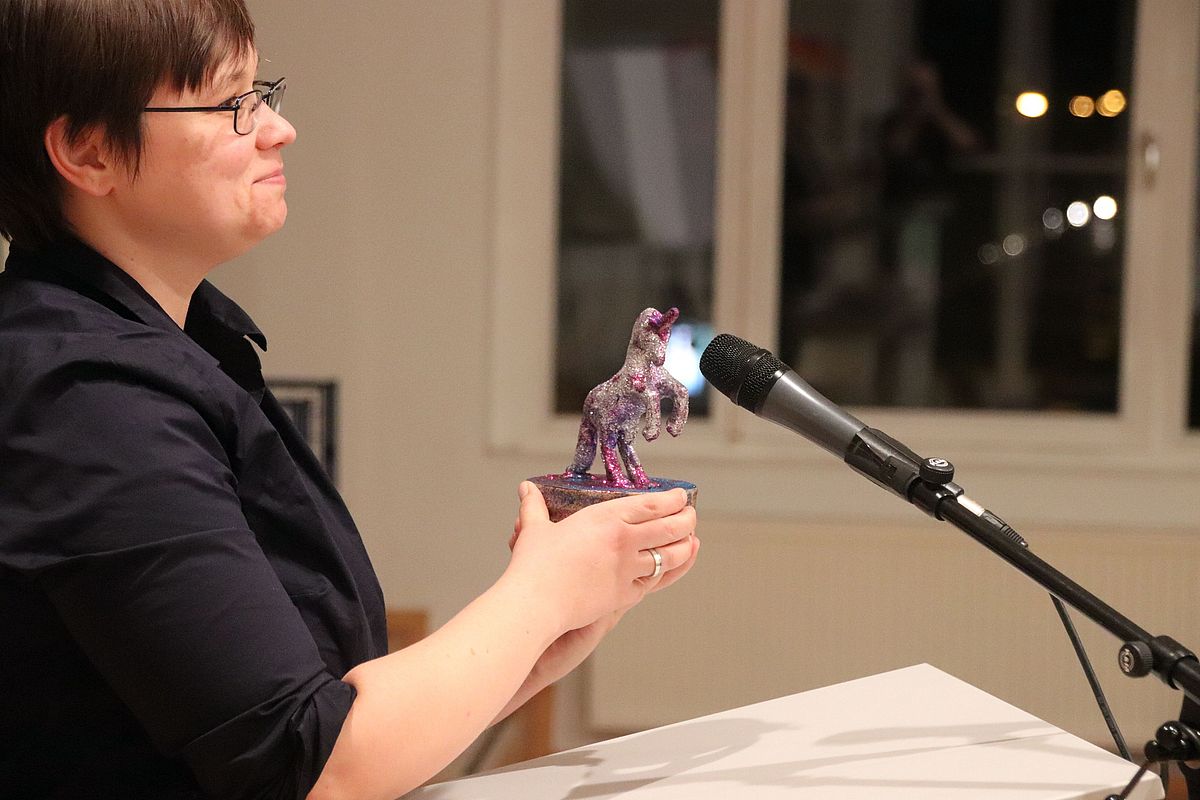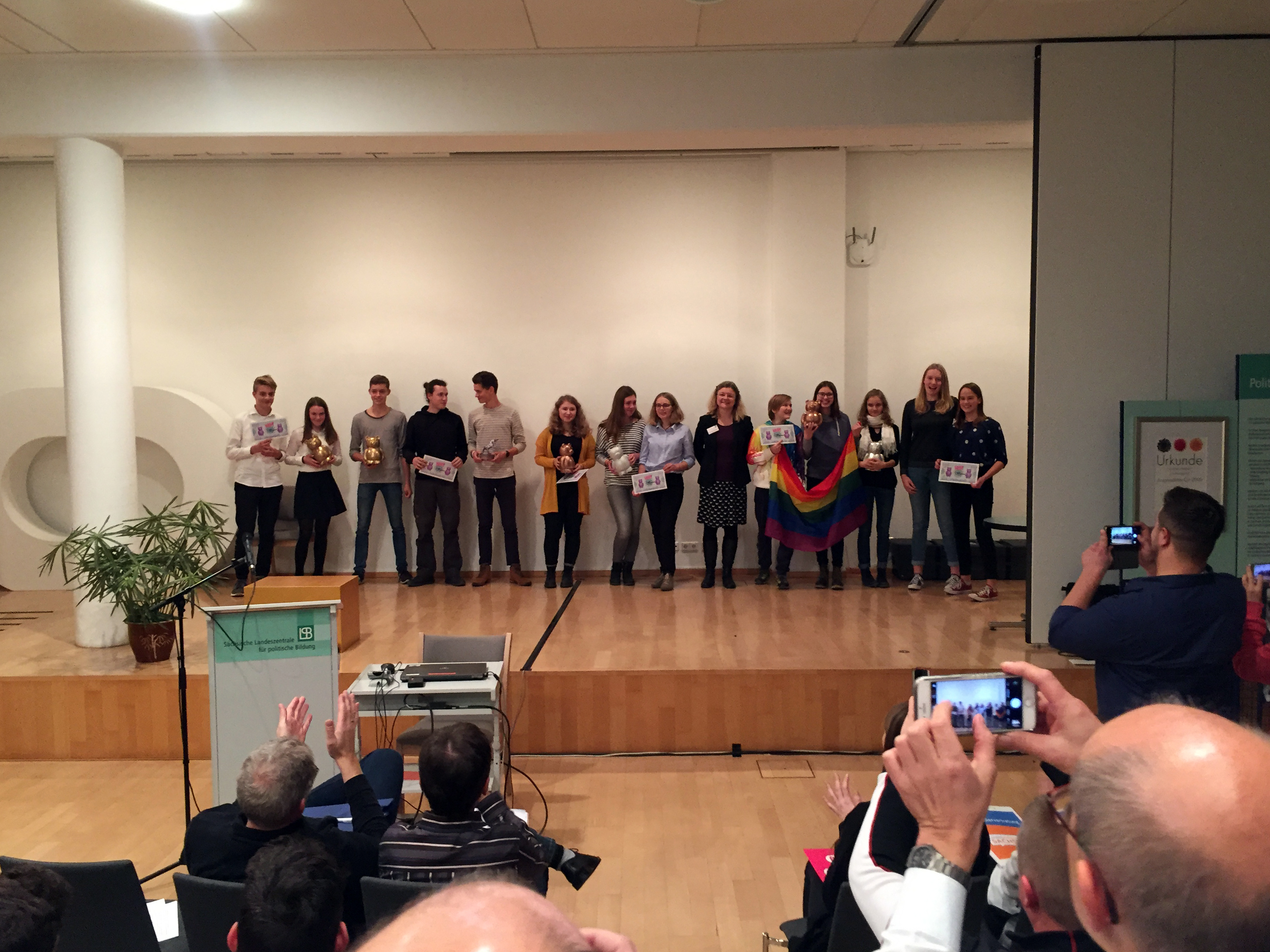 Dann ging es an die Preisverleihung. Die Jury, bestehend aus Dr. Joachim Amm (SLpB), Prof. Dr. Anja Besand (TU Dresden), Andreas Golinsky (Medienpädagoge), Joanna Maria Kesicka (Landesschülerrat Sachsen) und Jenny Neukirch (objektiv e.V.) betonte mehrfach, wie schwer die Auswahl gefallen sei. Einige Filme hätten wohl besser abgeschnitten, konnten aber nicht in die engere Wahl fallen, da die Kriterien nicht eingehalten wurden.