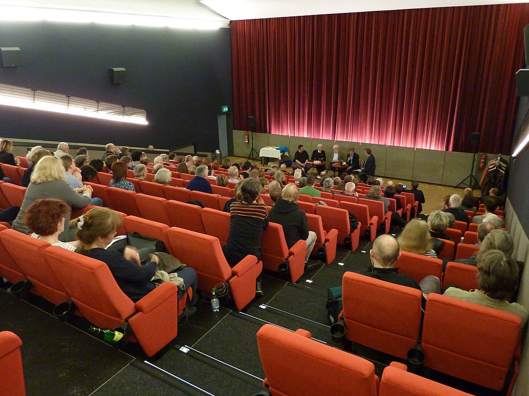 Die Podiumsgäste, die MDR-Moderator Tim Deisinger nach der Filmvorführung vorstellte, hatten ihren je eigenen Blick auf den Film: der Filmemacher selbst, Lutz Dammbeck, der Philosoph, Übersetzer und Universitätsdozent Helmut Kohlenberger, der Psychoanalytiker Hans-Joachim Maaz und der Gastgeber des Abends, der Direktor der Sächsischen Landeszentrale für politische Bildung Frank Richter. Eine Beschränkung auf eine Betrachtung der Nachkriegsjahre gab es mitnichten, die gegenwärtige Situation blieb ständig im Fokus.