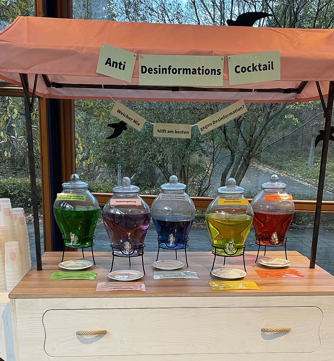 Während der Tagung hatte im Foyer die "Gerüchteküche" der JoDDID bereit gestanden, eine Art "interaktives Möbel" der politischen Bildung, an der sich die Teilnehmenden ein Getränk mixen konnten. Zur Auswahl standen die im letzten Vortrag dargestellten fünf möglichen "Medikamente" gegen Desinformation, hier repräsentiert durch fünf farbige Flüssigkeiten. Blickte man auf den "Wasserstand" der Getränke, so zeigte sich, dass aus Sicht der Teilnehmenden die Stärkung der resilienten Demokratie sowie die Förderung von Medienkompetenz die vielversprechendsten Mittel gegen Desinformation darstellten. Dieser Befund bildete den Ausgangspunkt der Abschlussrunde.