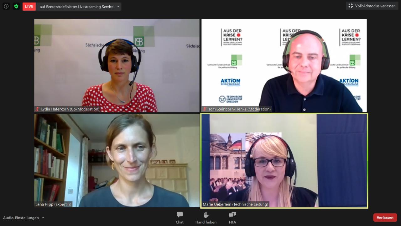 Bis zum 17. Juli veranstaltet die SLpB Online-Bürgerdebatten, in der die Menschen im Freistaat aufgerufen sind, mit Fachleuten über die Folgen der Coronakrise zu diskutieren. Weitere Informationen finden Sie hier.