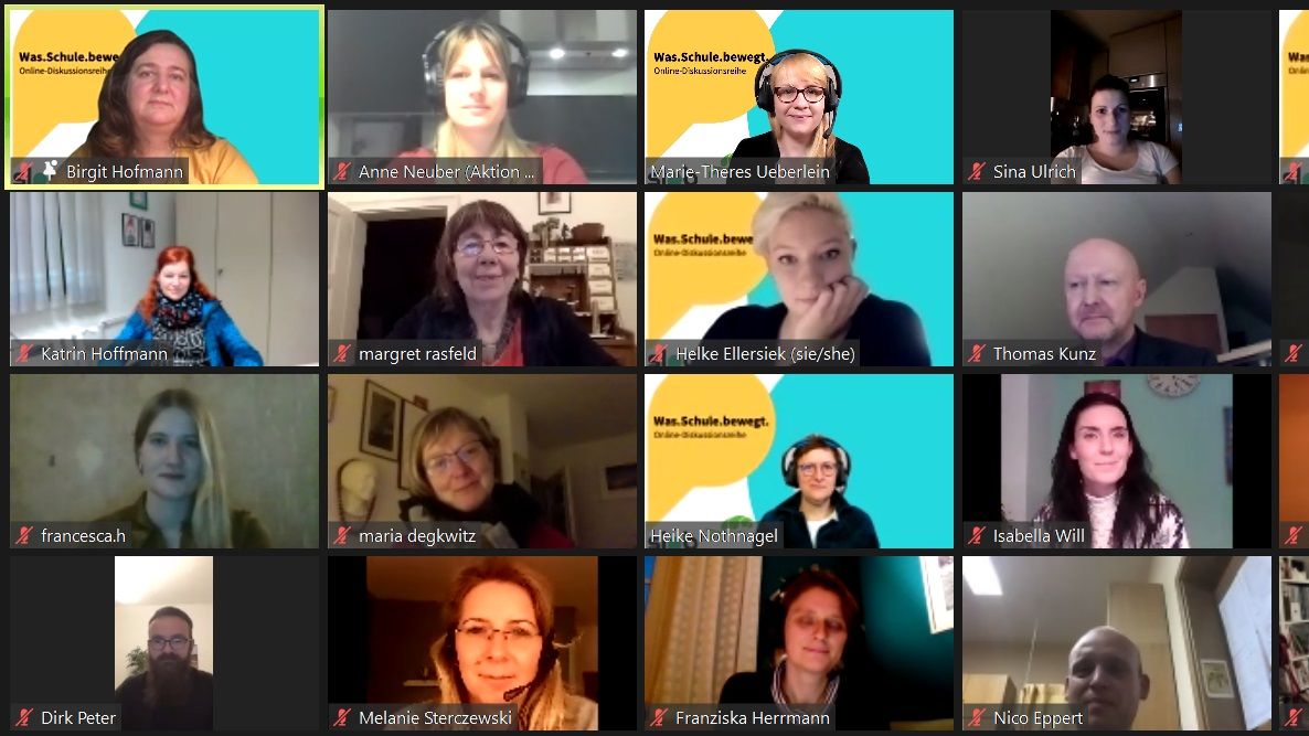 Damit trotz der Gruppengröße noch ein sinnvoller Austausch möglich bleibt, werden die Gruppen nach unterschiedlichen Methoden aufgeteilt – mal durch Fishbowl-Diskussionen, mal durch Breakout-Sessions, also durch Kleingruppen innerhalb der Zoomkonferenz, in denen sich die unterschiedlichen Konstellationen an Bildungsakteurinnen und -akteuren zusammenfinden können. Der Titel „Was.Schule.bewegt“ ist dabei Programm im doppelten Sinne. Er fragt: Was bewegt mich? Aber auch: Was kann ich bewegen?