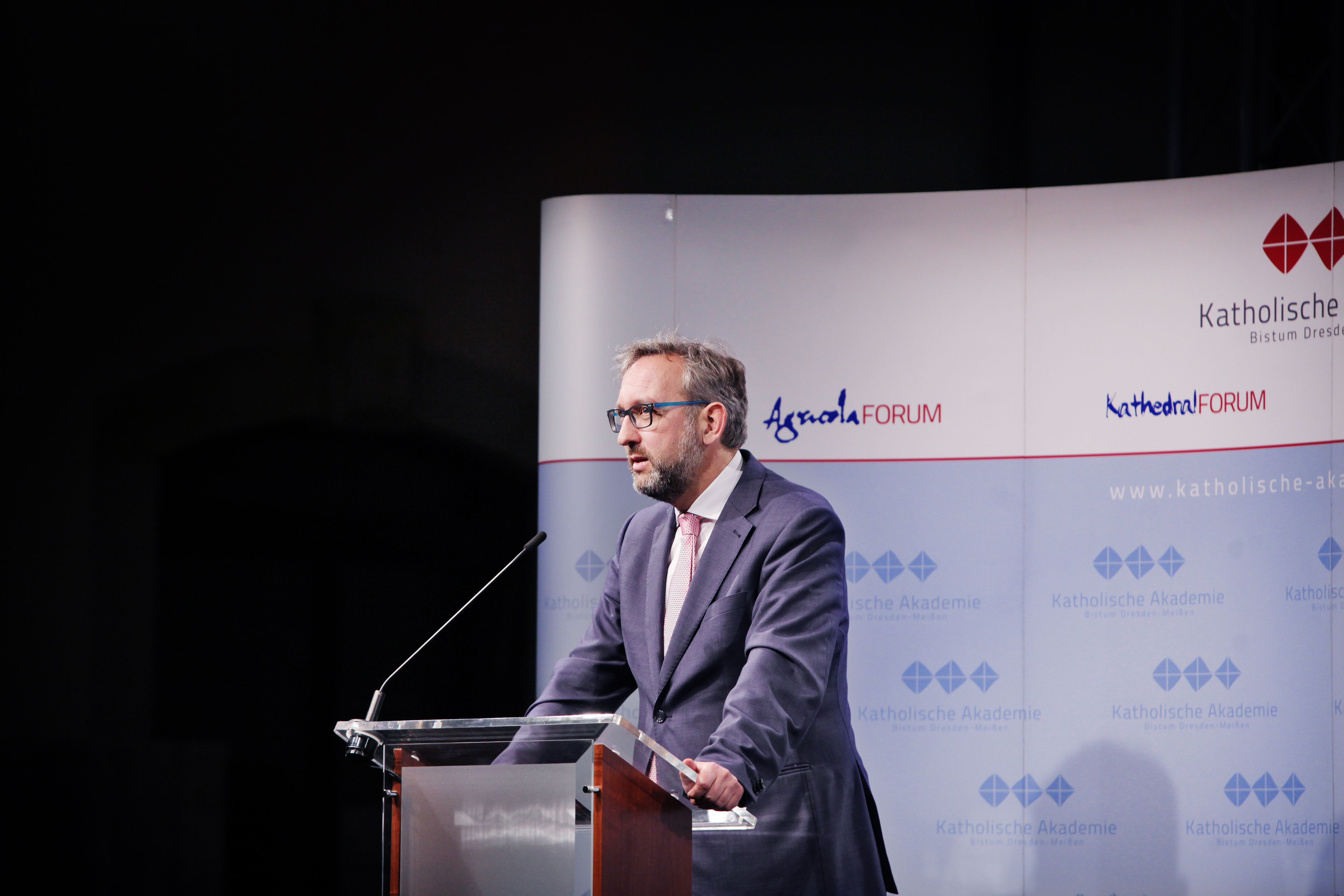 Leise Zweifel am postulierten friedlichen Zusammenwachsen ließ eingangs die Generaldirektorin der Kunstsammlungen Marion Ackermann erkennen. Teile der Bevölkerung stellten sogar die Grundwerte in Frage, konstatierte sie. Ihr Hinweis auf Diskussionen am Leipziger Grassi-Museum unter Polizeischutz fand seine Entsprechung in den Taschenkontrollen am Eingang zum Albertinum und in den Betonsperren an den umliegenden Weihnachtsmärkten. Misstrauen überall. „Die Furcht scheint kulturell zu dominieren“, bemerkte der ehemalige Bundespräsident in seiner Rede dann selber. Roland Löffler als Direktor der Landeszentrale für Politische Bildung griff zuvor den Veranstaltungstitel etwas zuversichtlicher auf. Er sprach von einem „rauen Land, das nichts mehr ersehnt als ein friedliches Zusammenleben“. Dazu könne ein „Labor der Debatten“ beitragen.