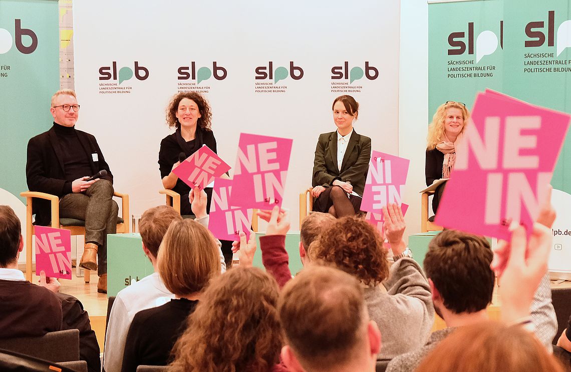 Die Abschluss-Diskussion mit Ine Dippmann, Isabel Bezzaoui, Rebecca Ciesielski und Nikolai Horn verließ den inhaltlichen Rahmen KI und Demokratie und fragte übergeordnet: Was kann und sollte der Mensch nicht aus der Hand geben?