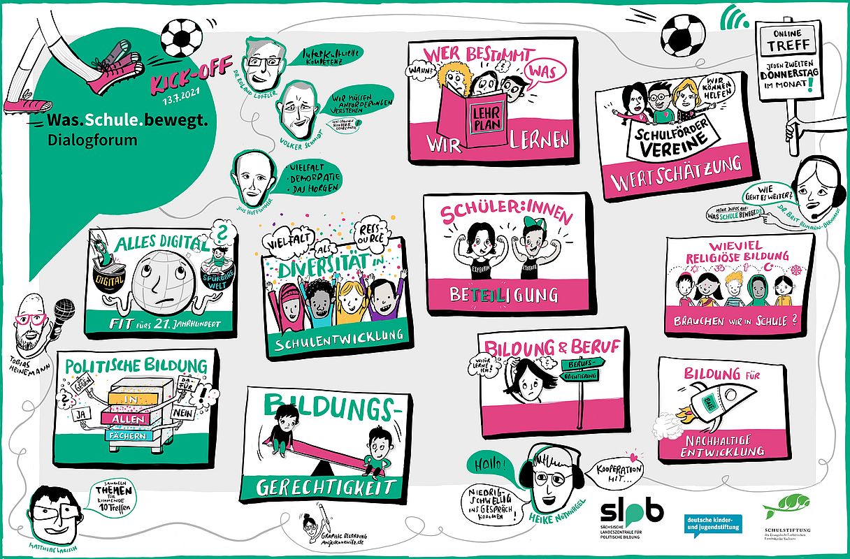 Auch Volker Schmidt von der Schulstiftung der Evangelisch-Lutherischen Landeskirche Sachsens will herausbekommen, was Schule bewegt. "Genau, um jene Zukunft des Lernens zu gestalten müssen wir verstehen, was Kinder und Jugendliche, aber auch Lehrkräfte in Zukunft brauchen", sagte er. "Drei Begriffe sind schon gefallen, die uns als Stiftung bewegen", sagte auch Jens Hoffsommer von der Deutschen Kinder- und Jugendstiftung Sachsen (DKJS): "Wie können wir junge Menschen so begleiten, dass sie gut für das Morgen gerüstet sind, was brauchen sie dafür heute? Wie kann man Kinder als Teil einer demokratischen Gesellschaft beteiligen? All das bewegt mich heute mehr denn je: In den scharfen Diskursen, die geführt werden, spielt Schule eine große Rolle und ist nicht mehr der Schonraum, war es vielleicht auch nie."