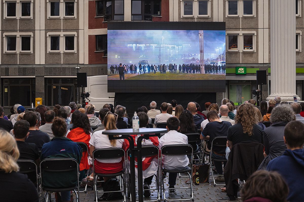 Der Ort ist nicht zufällig. Auch wenn es einfacher gewesen wäre, den Film in einem Kino oder einer schon vorhanden Open-Air-Bühne zu zeigen, hatte die Stiftung diesen Ort, den Platz vor der Nikolaikirche ganz bewusst gewählt: Von hier gingen 1989 die Bilder der friedlichen Proteste von DDR-Bürgerinnen und -Bürgern um die Welt. Das hatte auch den Regisseur Paluyan überzeugt, am Jahrestag der Proteste in Belarus nach Leipzig zu kommen.