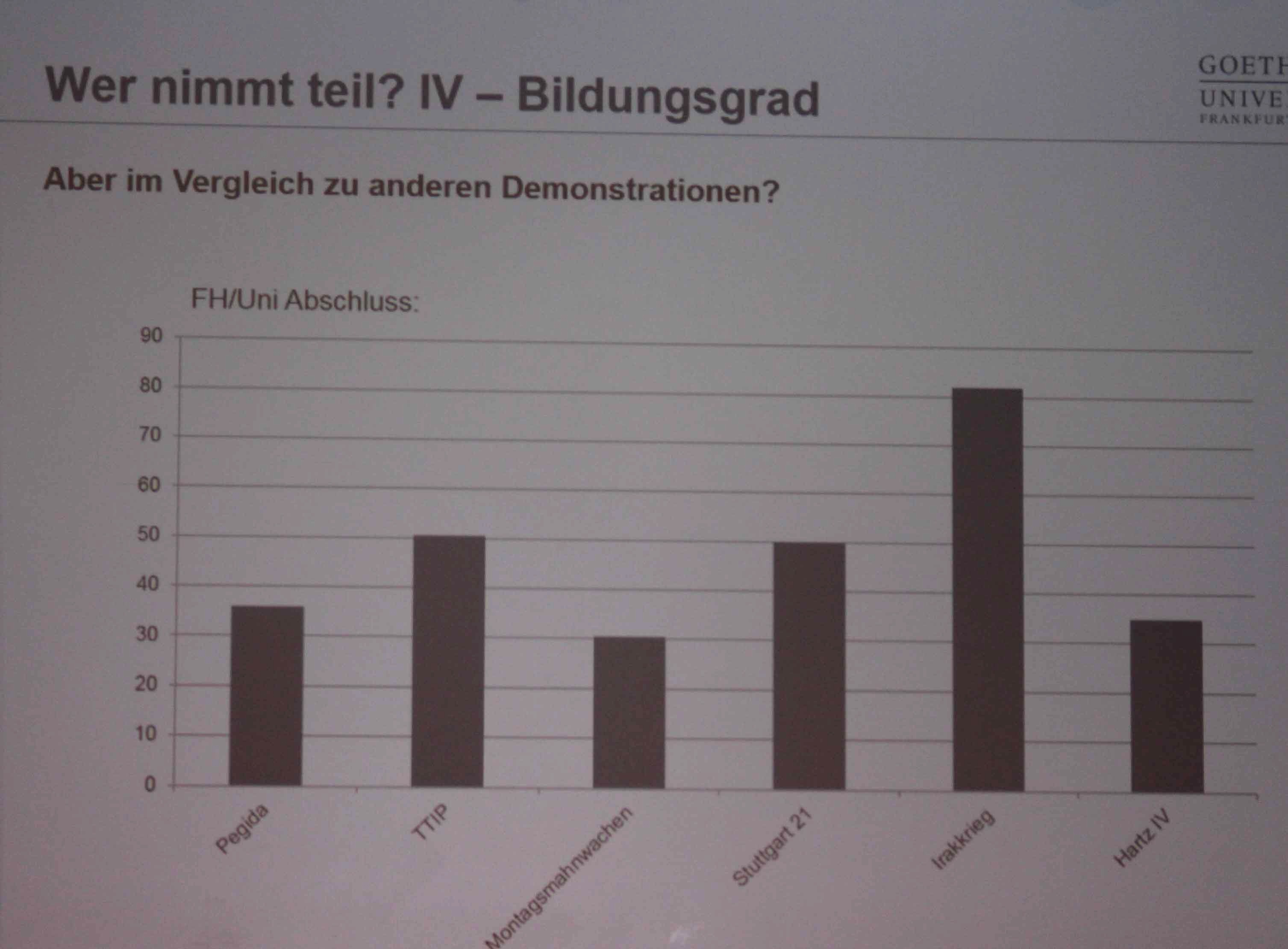 Die Umfrage ist durch die recht geringe Teilnahmequote nicht repräsentativ. Viele ihrer Kernbefunde decken sich aber mit früheren Untersuchungen der Politologen Prof. Werner Patzelt und Prof. Hans Vorländer von der TU Dresden. Neu ist insbesondere den Vergleich, den Priska Daphi mit ähnlichen Umfragen unter den Anhängern anderer Protestbewegungen angestellt hat. Dabei fällt beispielsweise auf, dass der Akademiker-Anteil (inklusive Fachhochschul-Abschluss) unter den Pegidisten mit rund 35 Prozent über dem allgemeinen Bevölkerungs-Durchschnitt liegt. Aber das ist ein Phänomen, das bei vielen anderen Protestbewegungen noch ausgeprägter ist: Unter den Demonstranten gegen den Irakkrieg in den 1990ern beispielsweise lag der Akademiker-Anteil bei über 80 Prozent, bei den Demos gegen das Bahnhofsprojekt „Stuttgart21“ und das Freihandelsabkommen „TTIP“ bei jeweils rund 50 Prozent.