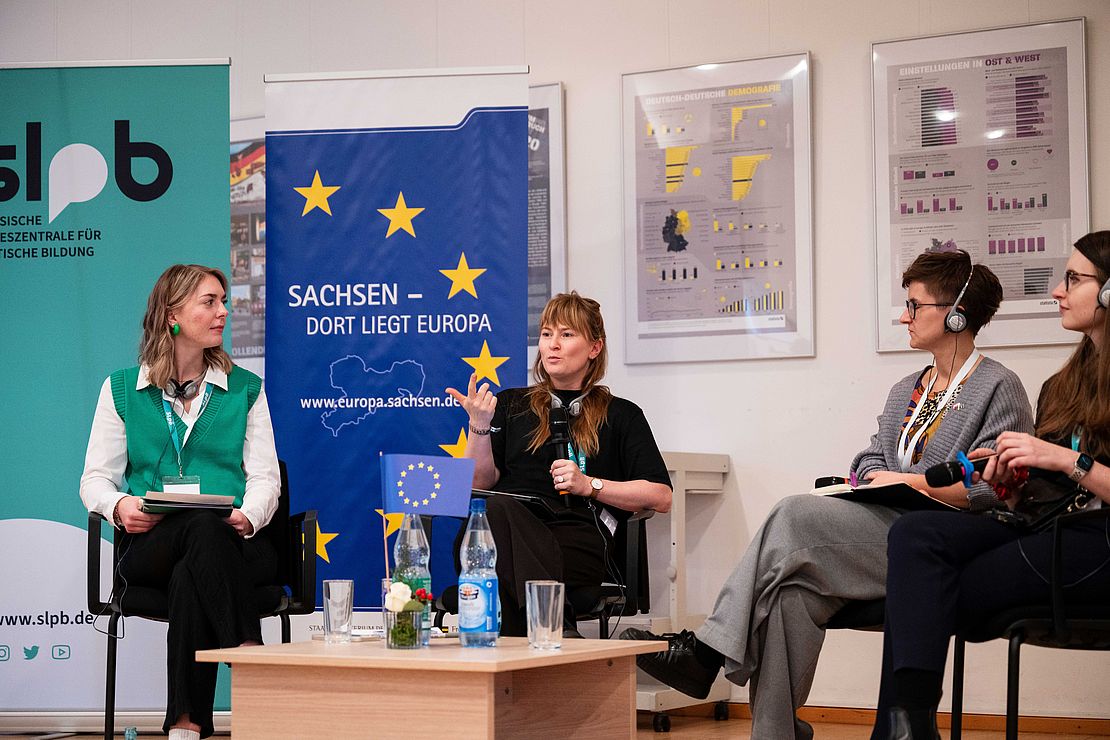 „Rechtsruck unter Erstwähler:innen in Europa? Warum haben junge Erwachsene oft europakritische und populistische oder sogar rechtsextreme Parteien gewählt? Wie soll die europapolitische Bildung darauf reagieren?“ Diesen Fragen stellten sich die drei Expertinnen auf dem der trinational besetzten Podium Freitagvormittag. Kristina Hubáčková, Abteilungsleiterin Europäische Kommunikation im Regierungsamt der Tschechischen Republik, diskutierte mit Iga Kamocka, der stellvertretenden Leiterin der polnischen Robert-Schuman-Stiftung und Annika Fleischer, der Co-Vorsitzenden der Jungen Europäischen Föderalist:innen Sachsen. Moderiert wurde das Panel von Katja Sinko, Projektkoordinatorin von Doppelstunde4EU & Europa im Kiez.