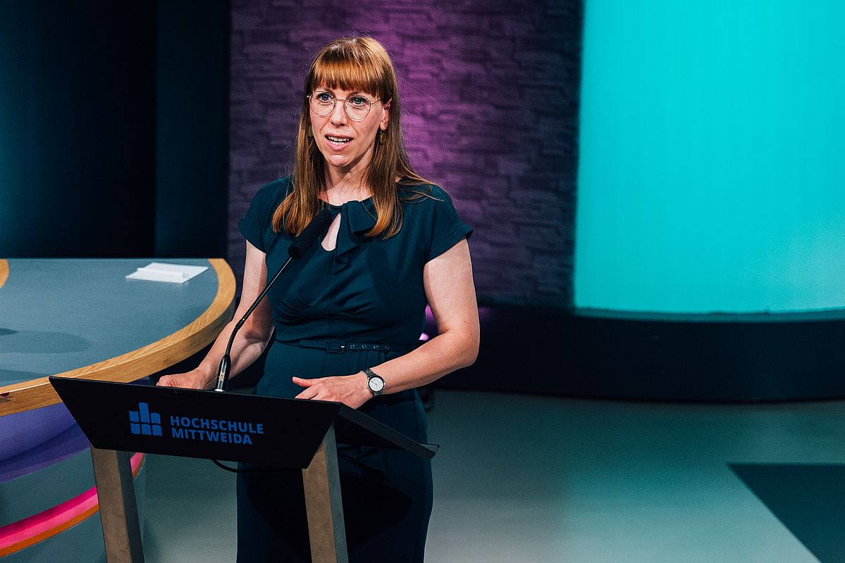 Constanze Kurz sitzt schon zum Soundcheck in dem Studio, in dem sonst die Studierenden ihre Produktionen üben. Das modern eingerichtete Herbert E. Graus-Studio hat alles da, was eine professionelle Podiumsdiskussion braucht und ist daher heute wie in den kommenden Monaten Kooperationspartner der SLpB: Die Veranstaltung ist auch als Testlauf für die anstehenden Wahlforen zur Bundestagswahl gedacht. Ganz bewusst arbeitet die Landeszentrale nicht mit einer hochprofessionellen Produktionsfirma zusammen, sondern kooperiert mit dem Medienforum der Hochschule. "Die Zusammenarbeit ist uns einfach sympathischer und dichter dran an der sächsischen Realität, auch weil die Studierenden hier und an uns lernen, wie sie später arbeiten", sagt Christina Wittich, Referentin für Presse und Öffentlichkeitsarbeit, die später während der Podiumsdiskussion live die Fragen aus den Sozialen Medien an die Podiumsdiskutierenden weitergeben wird.