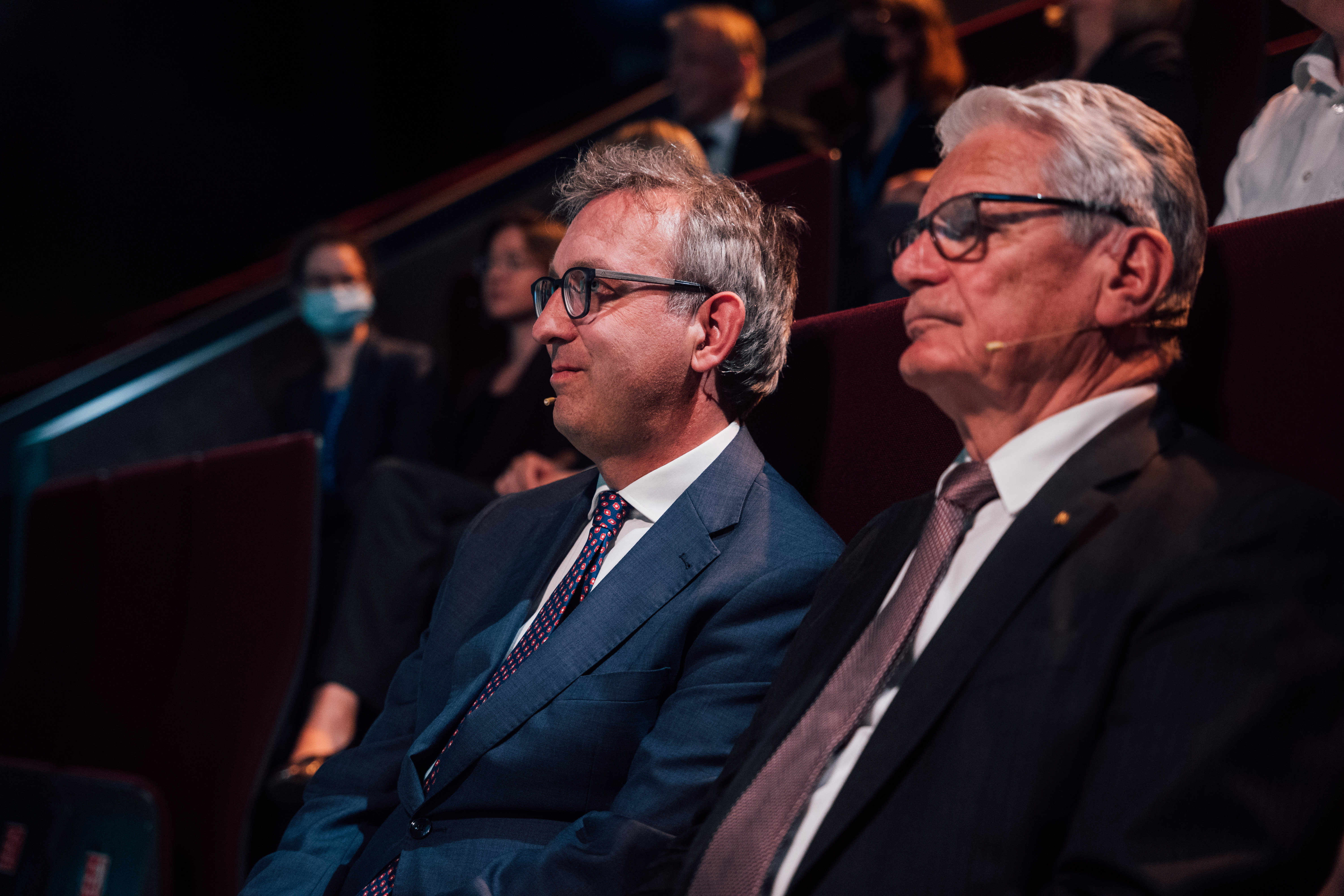 Schließlich hält Altbundespräsident Joachim Gauck seine Festrede. Er sieht, in Anlehnung an den Soziologen Ralf Dahrendorf, vor allem die Gefahr einer Polarität zwischen dem Wunsch nach einer offenen und einer geschlossenen Gesellschaft. Dagegen setzt er einen Appell für Geduld, für konstruktiven Streit und Kontroversen. "Wir brauchen die Auseinandersetzung, entschlossen, auch deutlich, aber mit Zivilität, ohne Ausgrenzung, und vor allen Dingen ohne Verachtung", sagt er. "Demokratie darf Unterschiede nicht glattbügeln, sondern sie muss umgekehrt Raum geben für Differenz und Widerspruch."
