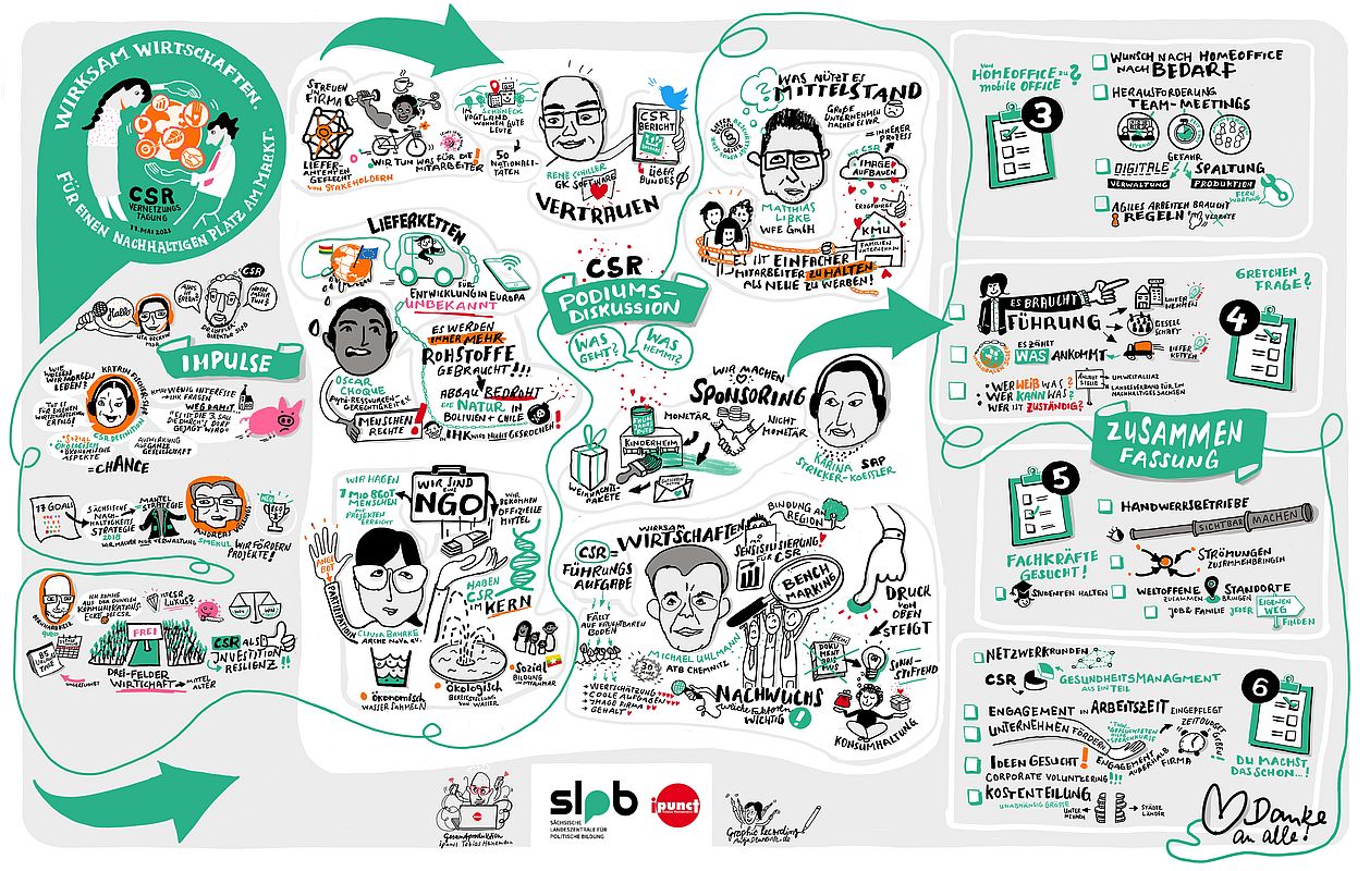 In den Vorträgen und besonders in den acht Denk-Räumen der Breakout-Session wurde über hoffnungsvolle und engagierte sächsische Beispiele berichtet. In diesen kleineren Kreisen plauderten die Teilnehmenden ohnehin lockerer, zum Beispiel über regelmäßige Bierrunden, bei denen sie über die Lage der Firma diskutieren. Karina Stricker-Kössler erwähnte das Engagement der Dresdner SAP-Niederlassung für das Kinderhaus "Rabe". Beispiele weltweiten Engagements schilderte Clivia Bahrke von der allerdings auch öffentlich geförderten Hilfsorganisation "arche nova".