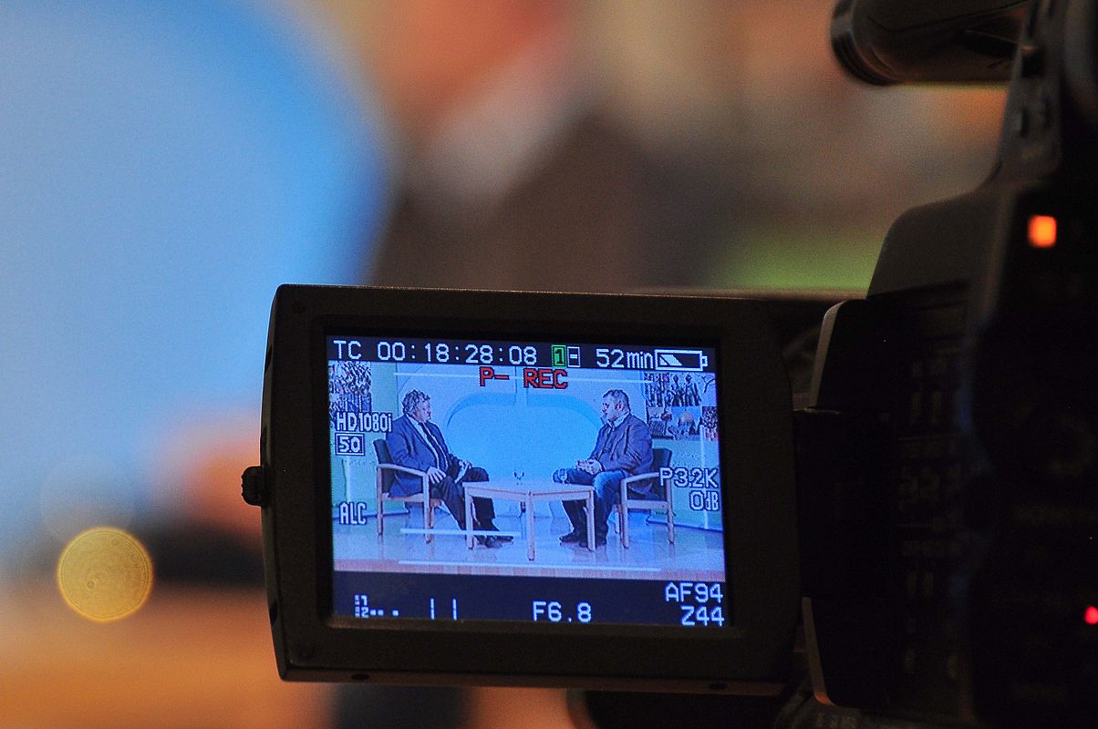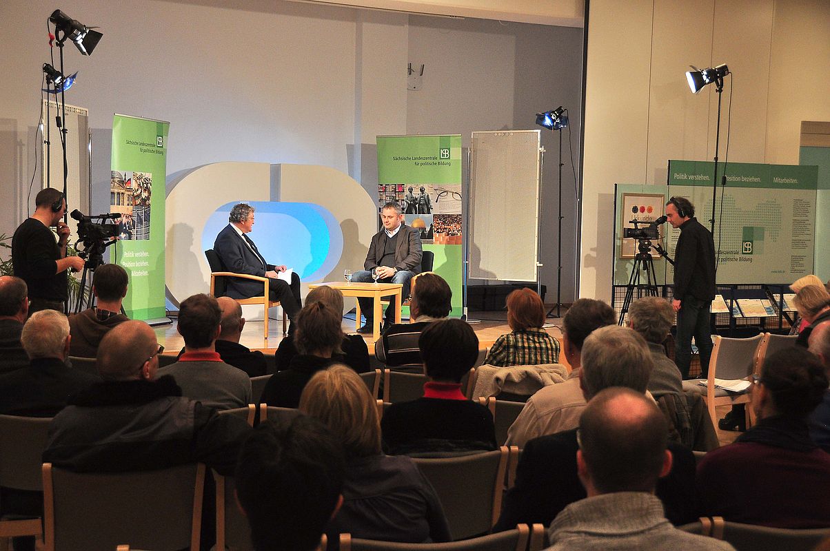 Im vollen großen Vortragssaal des Schützenhofs sprechen die beiden zunächst 15 Minuten miteinander über die aktuelle Situation in Polen und werden dabei für dresdeneins.tv aufgezeichnet. Anschließend folgt eine ausführliche Frage- und Diskussionsrunde.