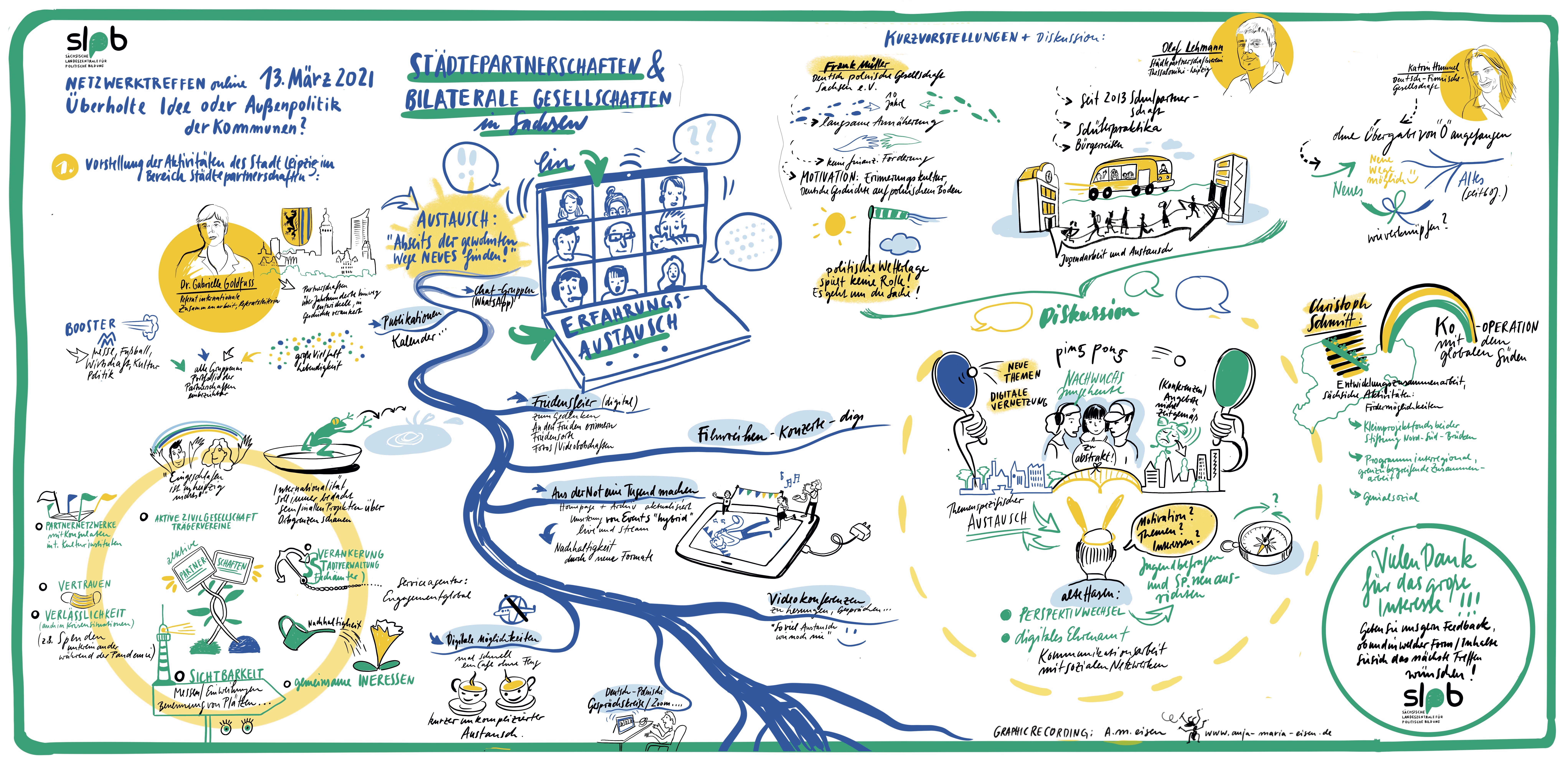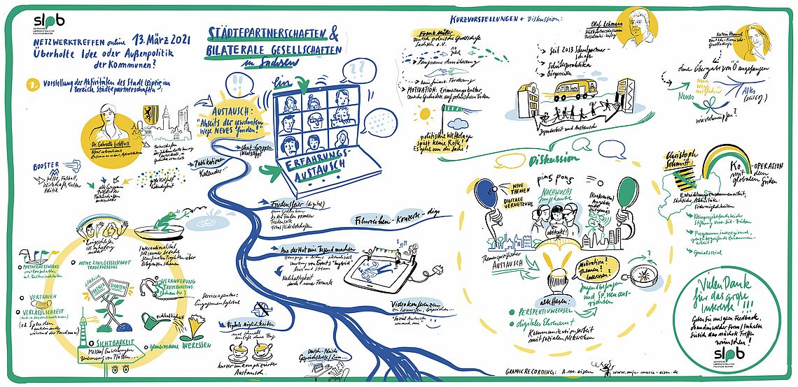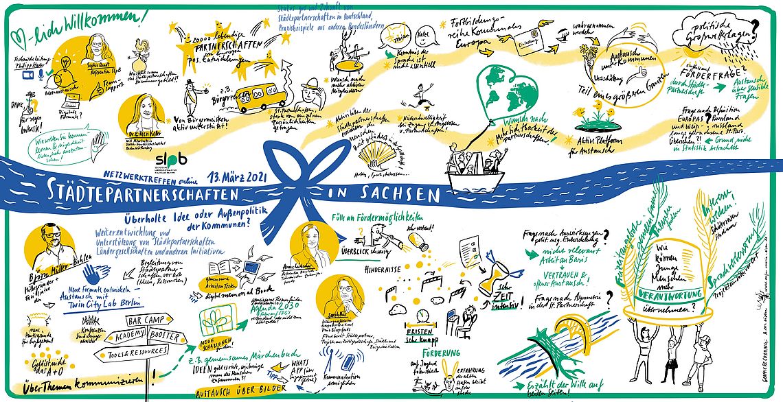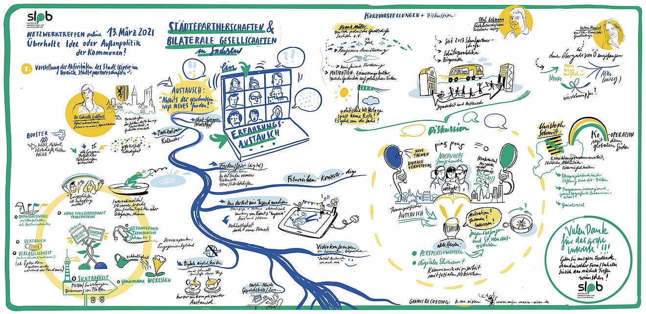Das Netzwerktreffen fand online statt, rund 40 Vertreterinnen und Vertreter von Städten und Gemeinden in ganz Sachsen, von Partnerschaftsvereinen oder einfach Interessierte wählten sich an diesem Samstagnachmittag ein in die Zoom-Veranstaltung. Drei Stunden lang diskutierten sie über den Status quo der Partnerschaften, tauschten eigene Erfahrungen aus und entwarfen Ideen zur Weiterentwicklung und Unterstützung von Initiativen.