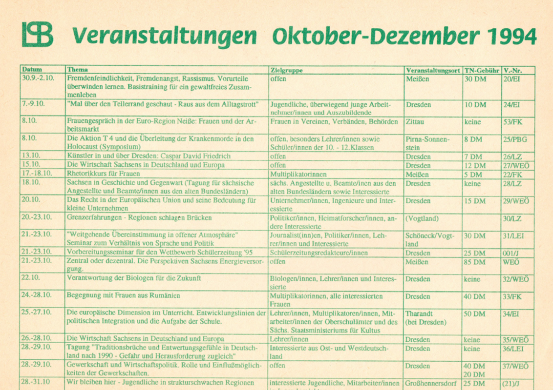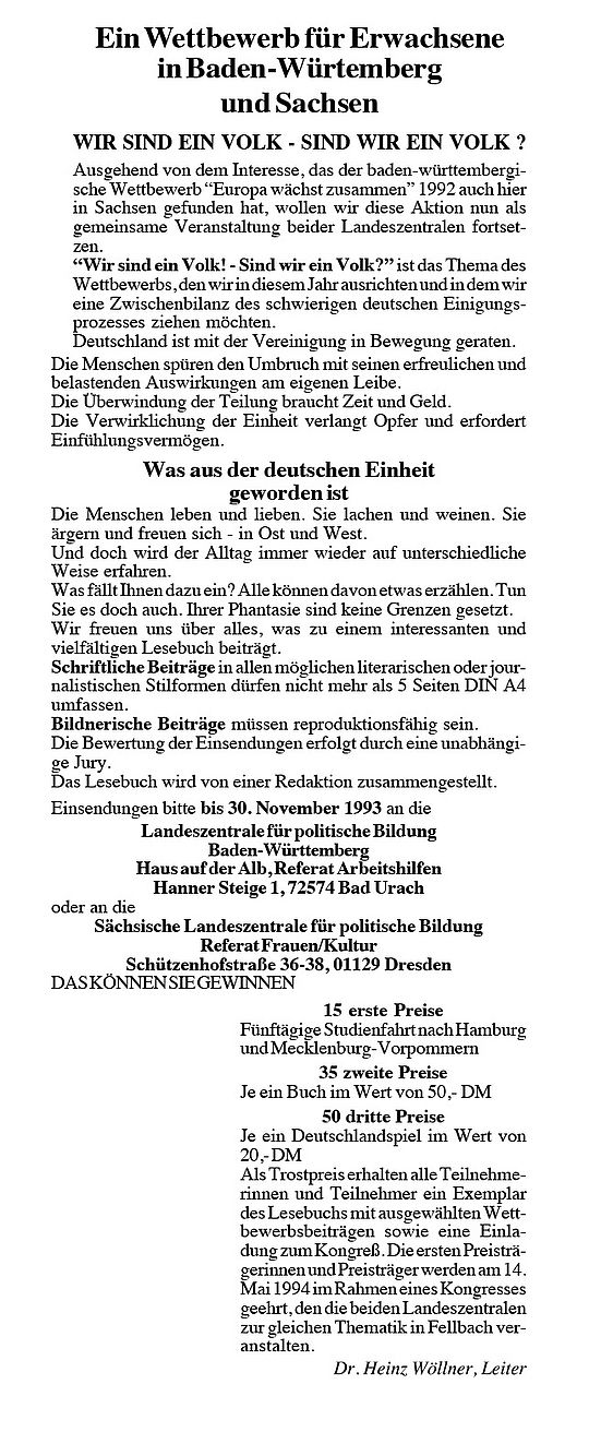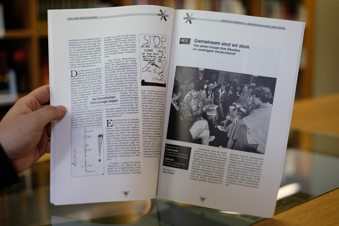 Dieses Thema stellt im fünften Jahr nach der Friedlichen Revolution den Schwerpunkt der Zusammenarbeit zwischen den Landeszentralen Baden-Württemberg und Sachsen dar. In beiden Häusern ist man überzeugt, dass das Zusammenwachsen von Ost und West am besten über das persönliche Kennenlernen gelingt. Am 14. Mai 1994 wird deshalb erstmals ein „Tag der Begegnung” mit Menschen aus beiden Bundesländern in der Schwabenlandhalle in Fellbach bei Stuttgart veranstaltet. Fast 1500 Teilnehmerinnen und Teilnehmer, darunter 600 aus Sachsen, diskutieren in 10 Gesprächskreisen über verschiedene Aspekte der Deutschen Einheit.