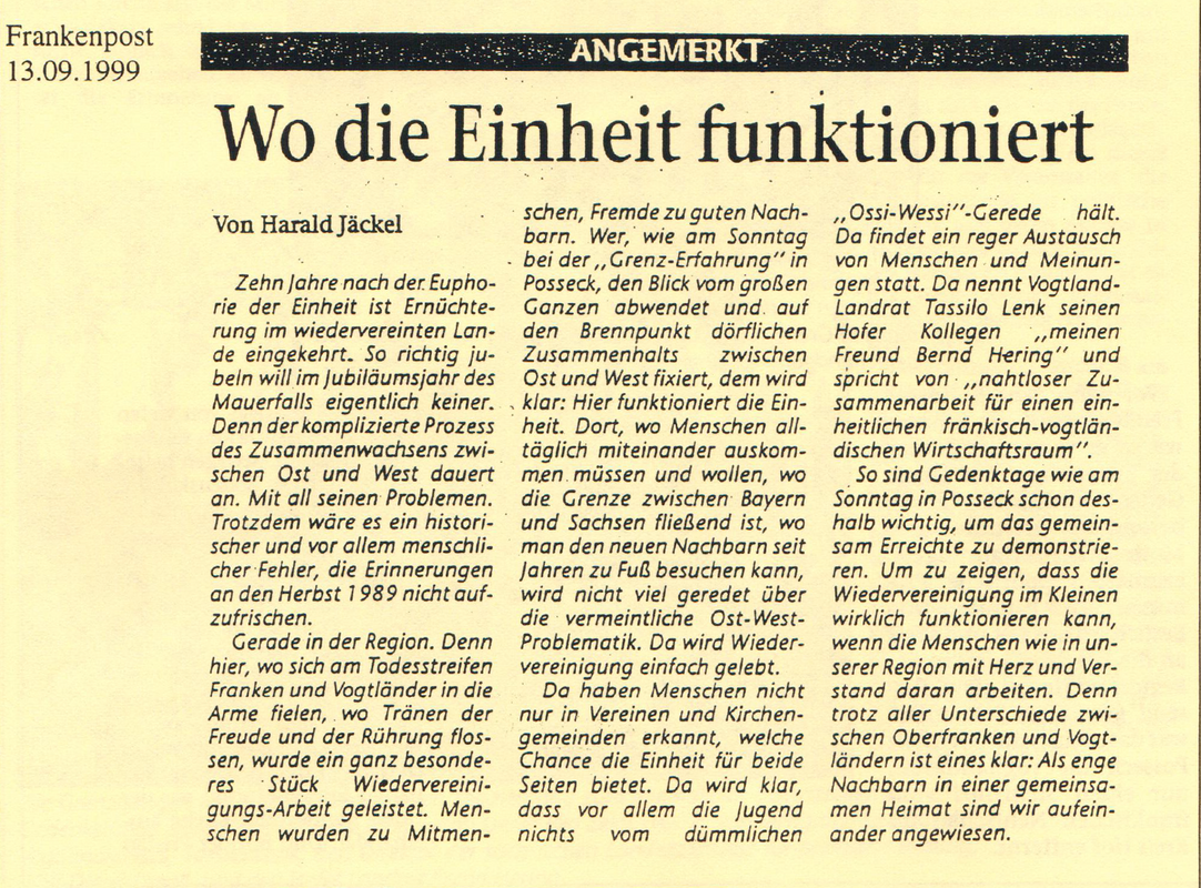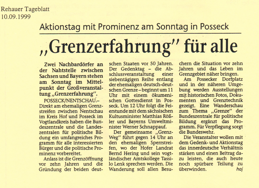 Zehn Jahre zuvor war die innerdeutsche Grenze geöffnet worden, die auch zwischen Nentschau im fränkischen Kreis Hof und Posseck im sächsischen Vogtlandkreis verlief. Symbolisch gehen an diesem Tag Staatsminister und Kommunalpolitiker aus Bayern und Sachsen mit zahlreichen Teilnehmerinnen und Teilnehmern den ehemaligen Grenzverlauf ab. Auch das deutsch-deutsche Museum im nahegelegenen Mödlareuth ist als Gedenkort in die Großveranstaltung eingebunden.