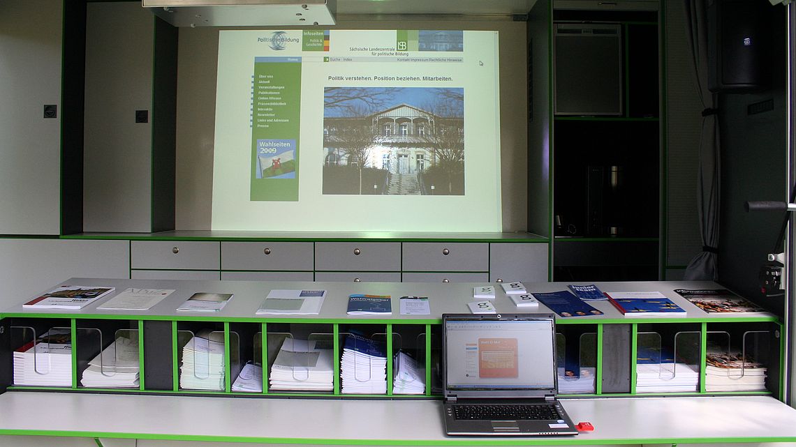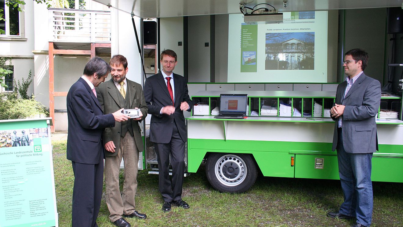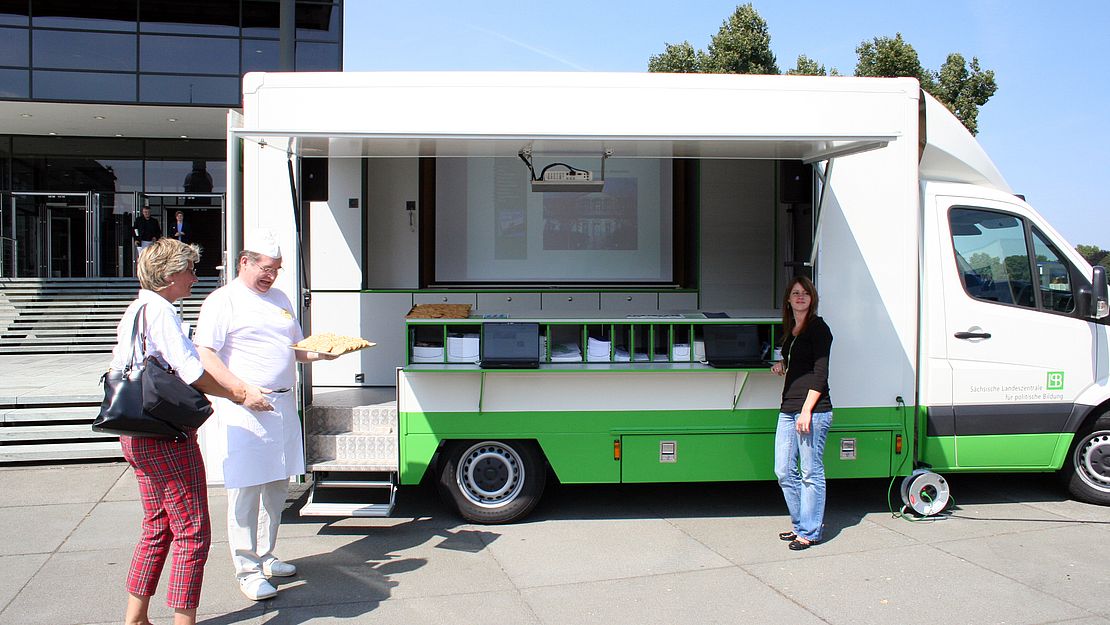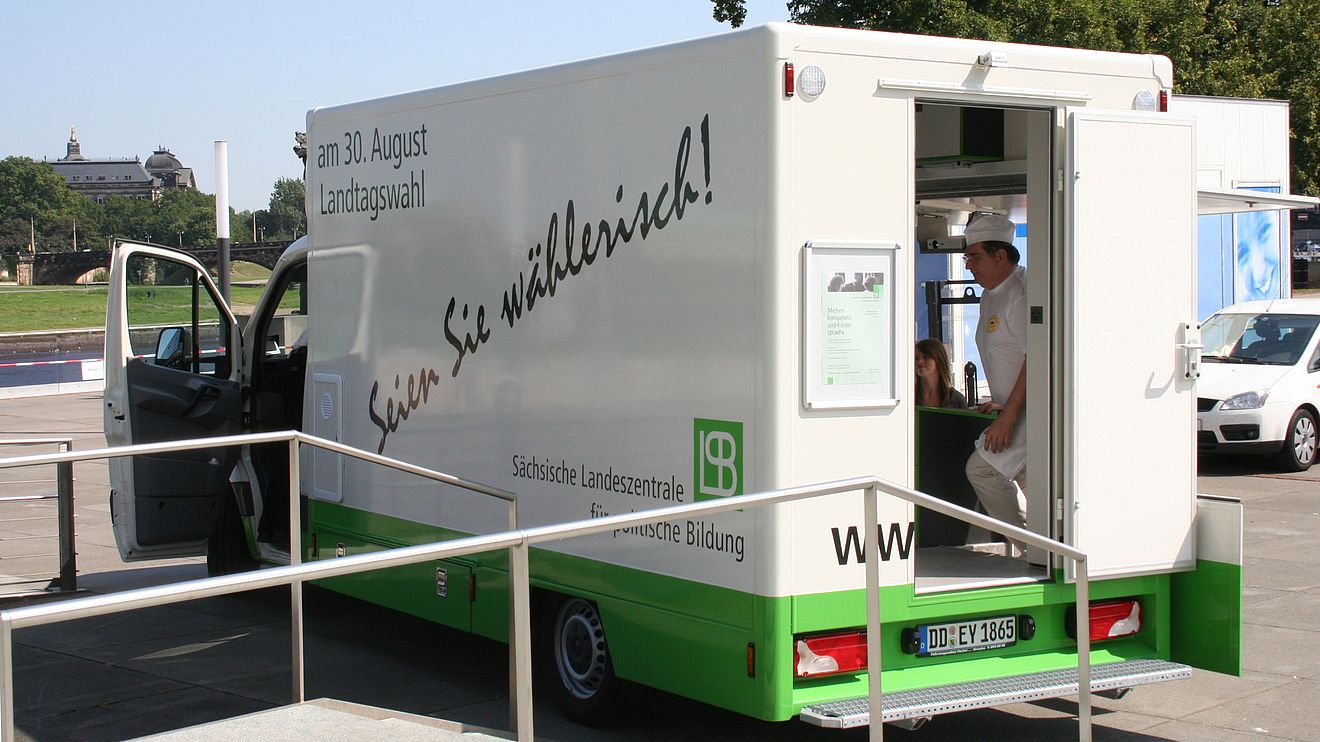 Inspiriert von der mobilen Arbeit der Sächsischen Landesstiftung für Natur und Umwelt kann die SLpB ab sofort ebenfalls mit einem eigenen Infomobil den Dialog vor Ort intensivieren, mit Bürgerinnen und Bürgern aus Adorf im Vogtland bis hin nach Zittau im Gebirge. An Bord sind Bücher, Infomaterialien und Equipment für die interaktive Auseinandersetzung mit gesellschaftspolitischen Themen.