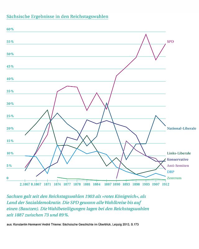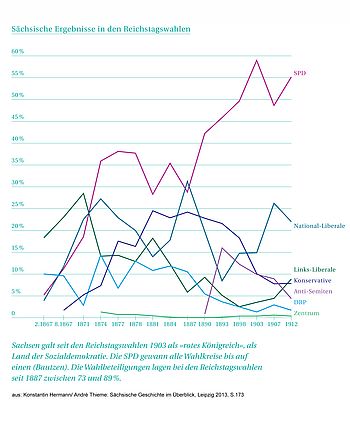 Sachsen galt jedoch trotz starker Sozialdemokratie und einflussreicher Gewerkschaften gleichzeitig als Hort der Reaktion, wo einflussreiche konservative Kreise ein restriktives Wahlrecht bis zum Ersten Weltkrieg erfolgreich verteidigten. 1896 wurde das Zensuswahlrecht, welches nach und nach den Anteil der Stimmberechtigten auf zwei Drittel der Reichstagswähler (allgemeines Männerwahlrecht) hatte anwachsen lassen, gegen ein Dreiklassenwahlrecht ersetzt, das noch weniger als zuvor eine repräsentative politische Vertretung der Bevölkerung zuließ.