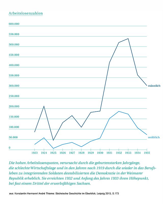 Es dominierten noch weitgehend die alten Branchenschwerpunkte (zum Beispiel Textilien) mit zu geringen Wachstumspotentialen. Die Arbeitslosenquote betrug im Juni 1933 in Sachsen 39,6 Prozent und lag damit weit über dem Reichsdurchschnitt. Wirtschaftliche Resignation trieb insbesondere die Mittelschicht in die Arme der extremen Rechten, welche als Abhilfe den Führerstaat und als Sündenbock „das Judentum“ propagierte.
