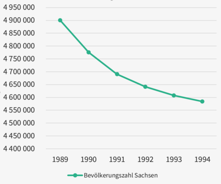 Die zumeist arbeitsmarktbedingte Abwanderung und besonders der massive Rückgang von Geburten zu Beginn der 90er Jahre führten in vielen sächsischen Städten zu einem erheblichen Bevölkerungsverlust bei gleichzeitigem Anstieg des Durchschnittsalters. Besonders in Ostsachsen (z. B. in Hoyerswerda, Weißwasser oder Görlitz) haben viele Städte seit 1989 bis zu einem Drittel ihrer Einwohnerschaft verloren. So ergibt sich ein ambivalentes Bild vom wirtschaftlichen Zustand des Freistaates, der bedeutend besser ist als in den europäischen Nachbarländern Polen und Tschechien, weitgehend besser als in den übrigen östlichen Bundesländern aber immer noch erheblich schlechter als in den westlichen Bundesländern.