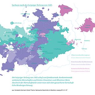 Im Jahre 1485 wurden in der sogenannten Leipziger Teilung die sächsischen Territorien zwischen den beiden wettinischen Brüdern Kurfürst Ernst und Herzog Albrecht in Gebiete mit jeweils getrennter und gemeinsamer Zuständigkeit untergliedert. Es entwickelte sich hieraus auch eine dynastische Teilung des Hauses Wettin in die ernestinische und die albertinische Linie. Die Albertiner (nach Herzog Albrecht benannt) blieben territorial im heutigen Sachsen beheimatet und residierten von nun an in Dresden. Die ernestinische Linie (nach Kurfüst Ernst benannt) verlegte ihren Schwerpunkt ins heutige Thüringen.
