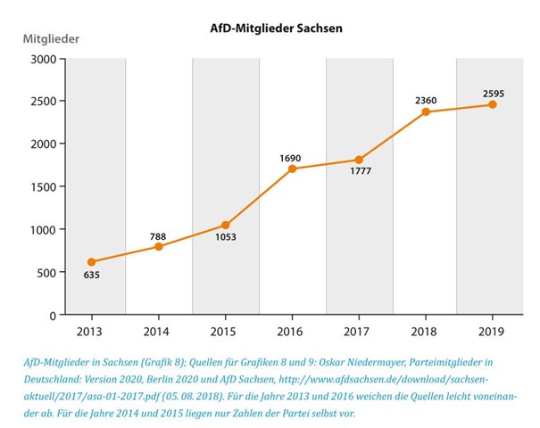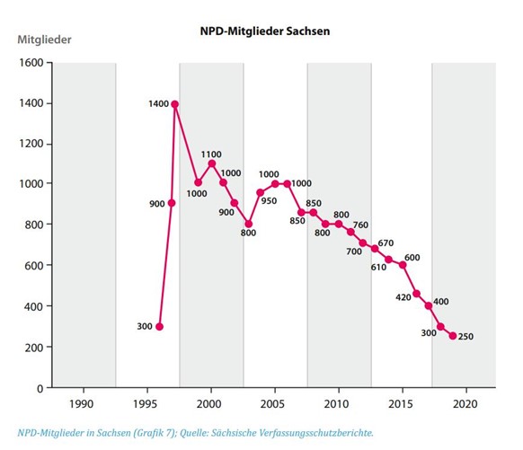 Wie bereits angedeutet verankerte die NPD sich schon früh in der sächsischen Parteienlandschaft, zum parlamentarischen Durchbruch gelang sie in Sachsen im Jahr 2004, als sie aus dem Stand mit 9,2% in den Sächsischen Landtag einzog, in der darauffolgenden Legislaturperiode gelang mit 5,6% der Wiedereinzug. 2014 scheiterte sie knapp daran, da auch hier bereits eine starke Abwanderung zur weniger extremistischen AfD eingesetzt hatte. Dieser gelang zur Europawahl 2019 schließlich, mit 25,3% vor der CDU stärkste Kraft zu werden. Zwar konnte sie die Spitze in der zurückliegenden Landtagswahl 2019 nicht verteidigen, landete jedoch mit 27,5% nur knapp hinter der CDU (32,1%) und sicherte sich so mit Abstand die Rolle als stärkste Oppositionsfraktion. Die NPD verschwand in diesem Jahr mit 0,6% in die parlamentarische Bedeutungslosigkeit, hatte teilweise aber auch selbst zur Wahl der AfD aufgerufen und betrachtet sich weitestgehend als ihre Wegbereiterin und Verbündete: Während sich die NPD um den „Kampf um die Straße“ kümmere, würde sie der AfD den „Kampf um die Wähler“ überlassen.
