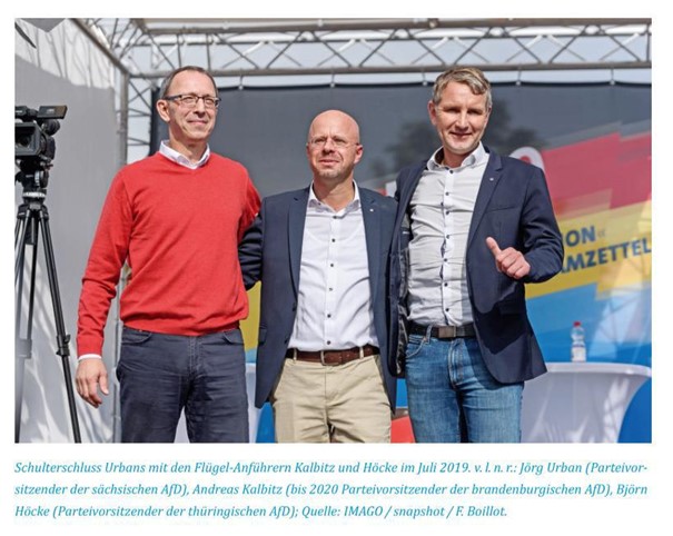 Die AfD sah sich einem solchen Verfahren bis dato nicht ausgesetzt, jedoch richten Sicherheitsbehörden, insbesondere der Verfassungsschutz, ihren Blick zunehmend auf Teile der Partei. So behandelt der sächsische Verfassungsschutz seit Februar 2021 den sächsischen Landesverband der AfD (neben anderen) als „Verdachtsfall“, was auch nachrichtendienstliche Mittel nach sich zieht. Besonders gerät dabei der sogenannte „Flügel“ in den Blick, eine innerparteiliche Vereinigung, die sich unter dem Druck der Öffentlichkeit und Parteispitze im Jahr 2020 formal auflöste. Der Bundesverfassungsschutz, welcher bei dem Flügel „gesichert rechtsextremistische Bestrebung gegen die freiheitliche demokratische Grundordnung“ als erwiesen ansah, geht jedoch von einer andauernder Aktivität des Netzwerkes aus. Die Vereinigung erfährt Unterstützung vor allem, aber nicht nur, aus den ostdeutschen Landesverbänden der AfD und machte vor allem durch die „Erfurter Resolution“ im Jahr 2015 auf sich aufmerksam. Die Unterzeichnenden forderten, die AfD solle sich als „Widerstandsbewegung gegen die weitere Aushöhlung der Souveränität und der Identität Deutschlands“ begreifen und kritisierten insbesondere, dass die Partei sich von zunehmend radikalisierten Protestbewegungen wie „PEGIDA“ oder „Pro Chemnitz“ distanzierte. Insgesamt ist die Frage der Zuordnung der Partei zum rechtsextrem Spektrum nicht eindeutig zu beantworten, vor allem, da die AfD ihre Wählerschaft bis weit ins konservative Lager mobilisiert. Zweifelsfrei ist unter Wissenschaftlerinnen und Wissenschaftlern jedoch die von Anfang bis heute zu beobachtende Bewegung der Partei, sich von ihrer stärker wirtschaftsliberalen Ausrichtung zu Gründungszeiten weg- und zu völkischen, rechtsradikalen und rechtsextremen Positionen hinzubewegen, sofern diese nicht schon innerparteilichen Konsens darstellen.
