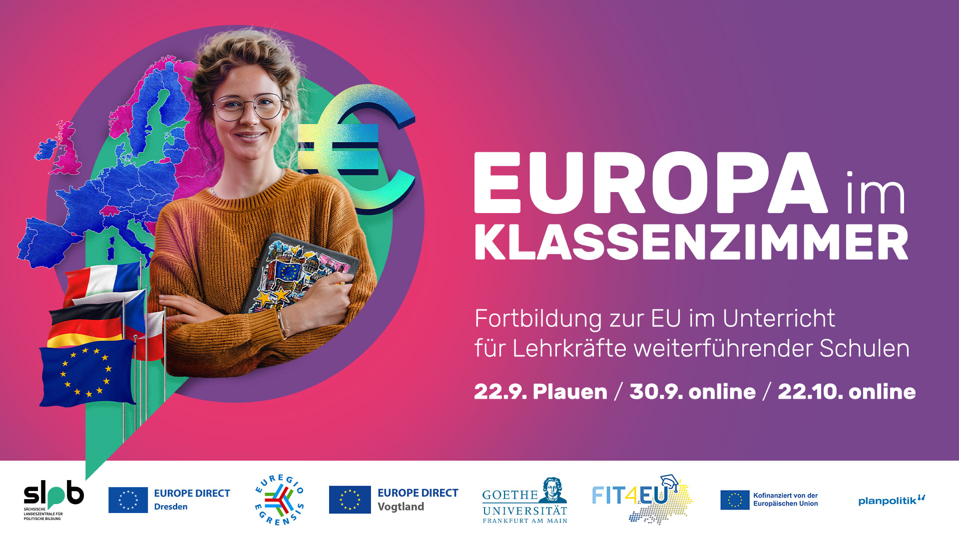 Die Fortbildungsreihe findet statt im Rahmen einer Kooperation mit dem Projekt „Fit4EU“, das von der Professur für Politikwissenschaft/Didaktik der Sozialwissenschaften der Goethe-Universität in Frankfurt am Main entwickelt und durchgeführt wird. Das Projekt „Fit4EU“ wird durch die Europäische Union kofinanziert. In dieser Fortbildungsreihe wurden sachsenspezifische Inhalte durch die EUROPE DIRECTs Dresden und Vogtland und die Sächsische Landeszentrale für politische Bildung ergänzt.