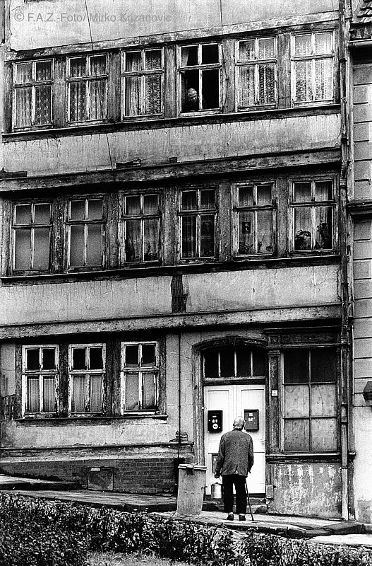 Beklemmende Tristesse in Erfurt. Ich bin froh darüber, die Szenerie nicht in Farbe fotografieren zu müssen – es würde noch bedrückender wirken.Fotografie: Leipzig, DDR, Oktober 1989