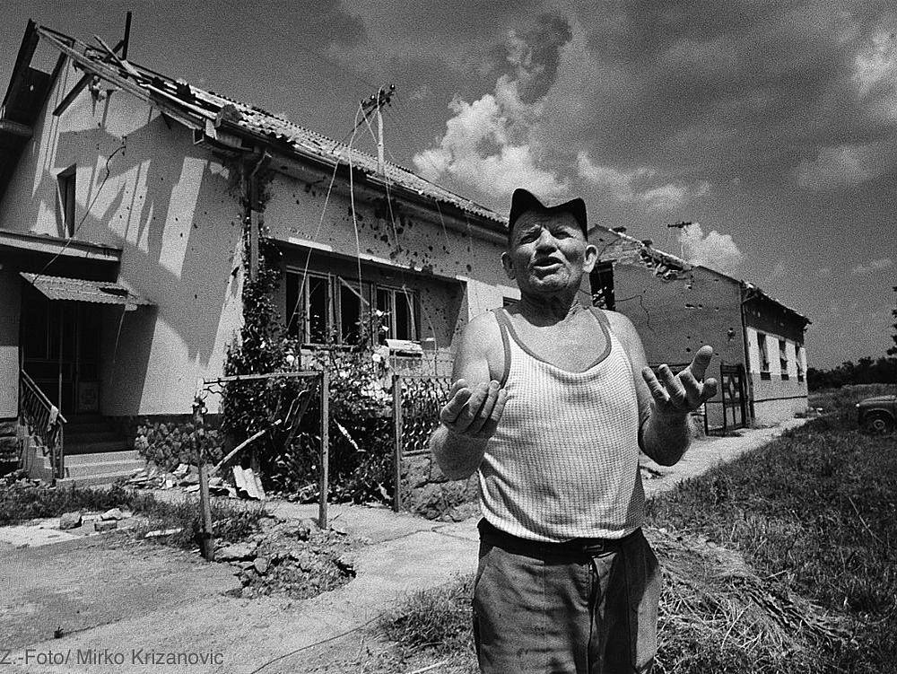 Fotografie: Slawonien, Kroatien, Juli 1992 Zerstörung, Leid und Klage in den Dörfern zwischen Osijek und Varaždin. Auf dem Weg nach Westen hatten serbische Panzer sein Haus beschossen, erzählte der Mann wütend und verzweifelt.