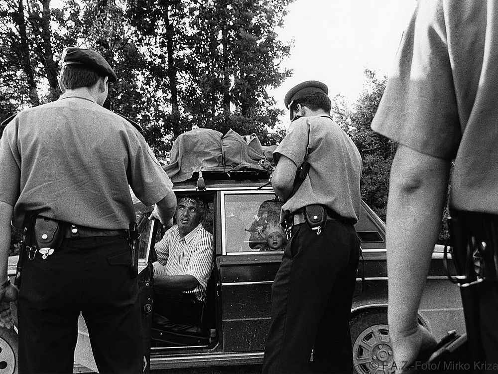 Fotografie: Bosnisch-Kroatische Grenze, August 1992 Zittern und Bangen. Eine bosnische Familie auf der Flucht aus Mostar. Kroatische Polizisten kontrollierten die Grenze und schickten viele Flüchtlinge wieder zurück.