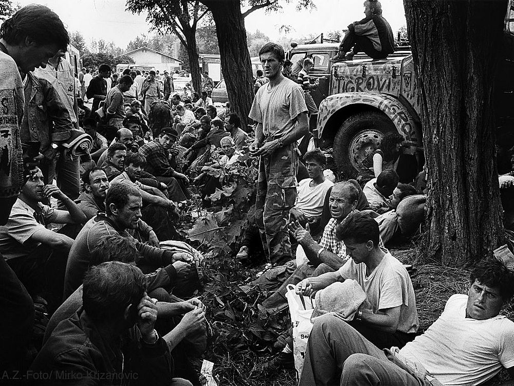 Fotografie: Bei Brcko, Kroatien, August 1992 Dem Kessel von Brcko entkommen. Erschöpfte bosnische Männer sammelten sich nördlich der jahrelang umkämpften Stadt. Sie hofften, dem drohenden Genozid entgehen zu können.