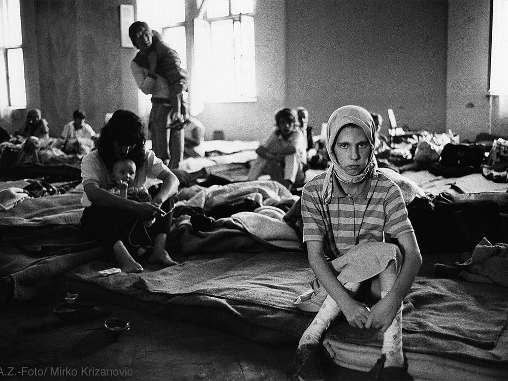Fotografie: Požega, Kroatien, August 1992 Notunterkunft für Flüchtlinge in einer Schule. Traumatisierte Kinder, ängstlich, apathisch und kaum ansprechbar. Die Eltern gaben ihren Kindern Halt, soweit es in der verzweifelten Lage möglich war.