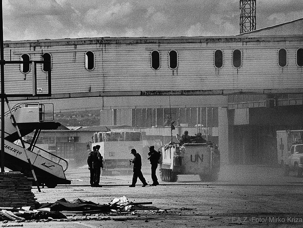 Fotografie: Sarajevo, Bosnien, August 1992 UN-Truppen am Flughafen in Sarajevo organisieren Hilfslieferungen für die belagerte Stadt. Über die berüchtigte „Sniper Alley“ werden sie in die Stadt gebracht und an die Bevölkerung ausgegeben. Höchste Sicherheitsstufe. Fotografieren nur mit schwerer Schutzweste.