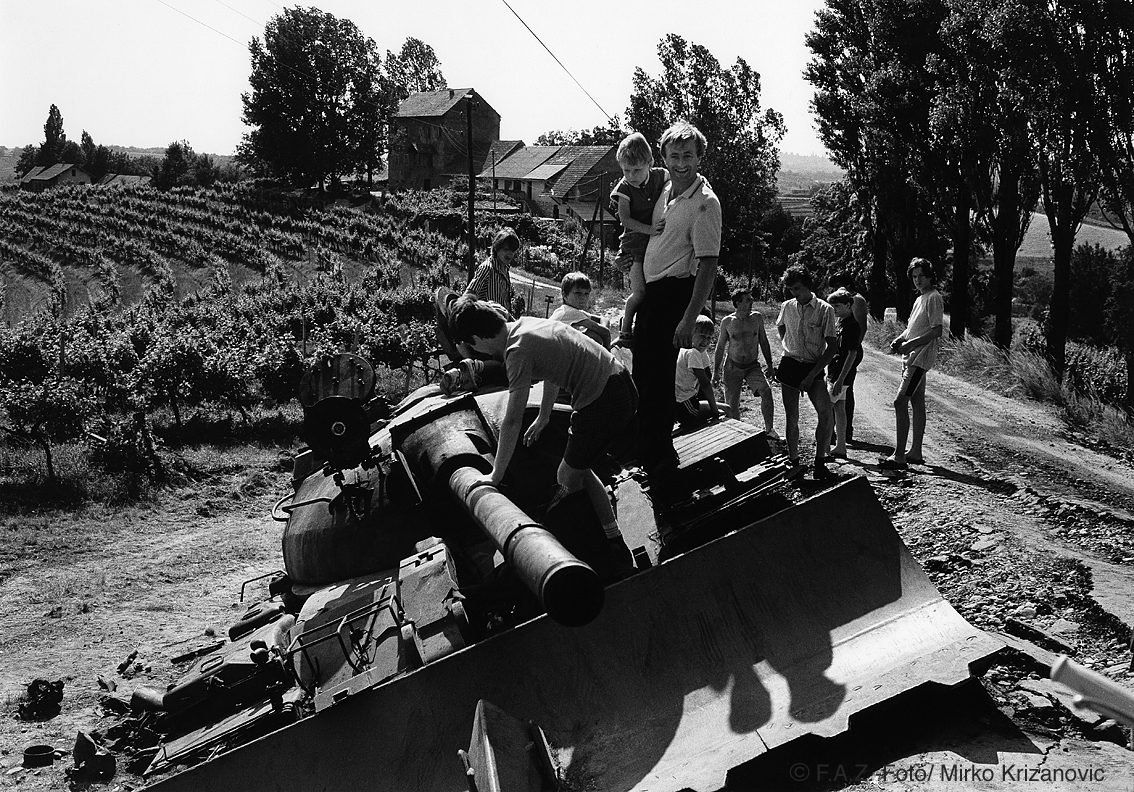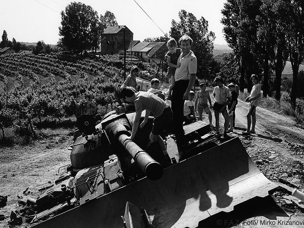 Fotografie: Nord-Slowenien, Juni 1991 Freude schaulustiger Slowenen über einen zerstörten serbischen Panzer. An der Grenze zu Kroatien wehrten slowenische Territorialkräfte im sogenannten 10-Tage-Krieg die erste Welle der serbischen Angreifer ab.